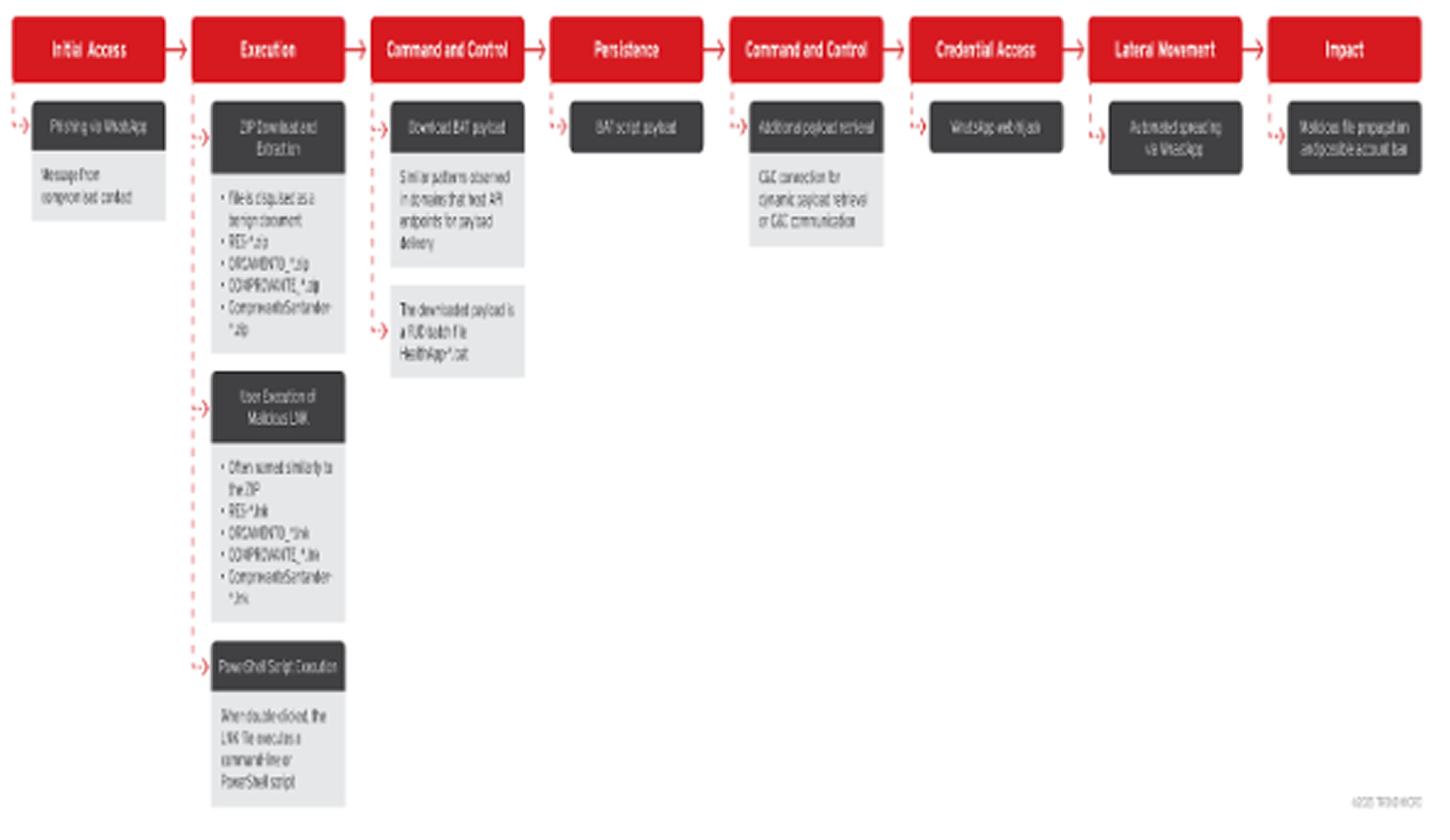 WhatsApp Spread If the malware detects that WhatsApp Web is active on the infected system, it automatically distributes the malicious ZIP file to all contacts and groups associated with the victim's account, allowing it to spread quickly and widely.