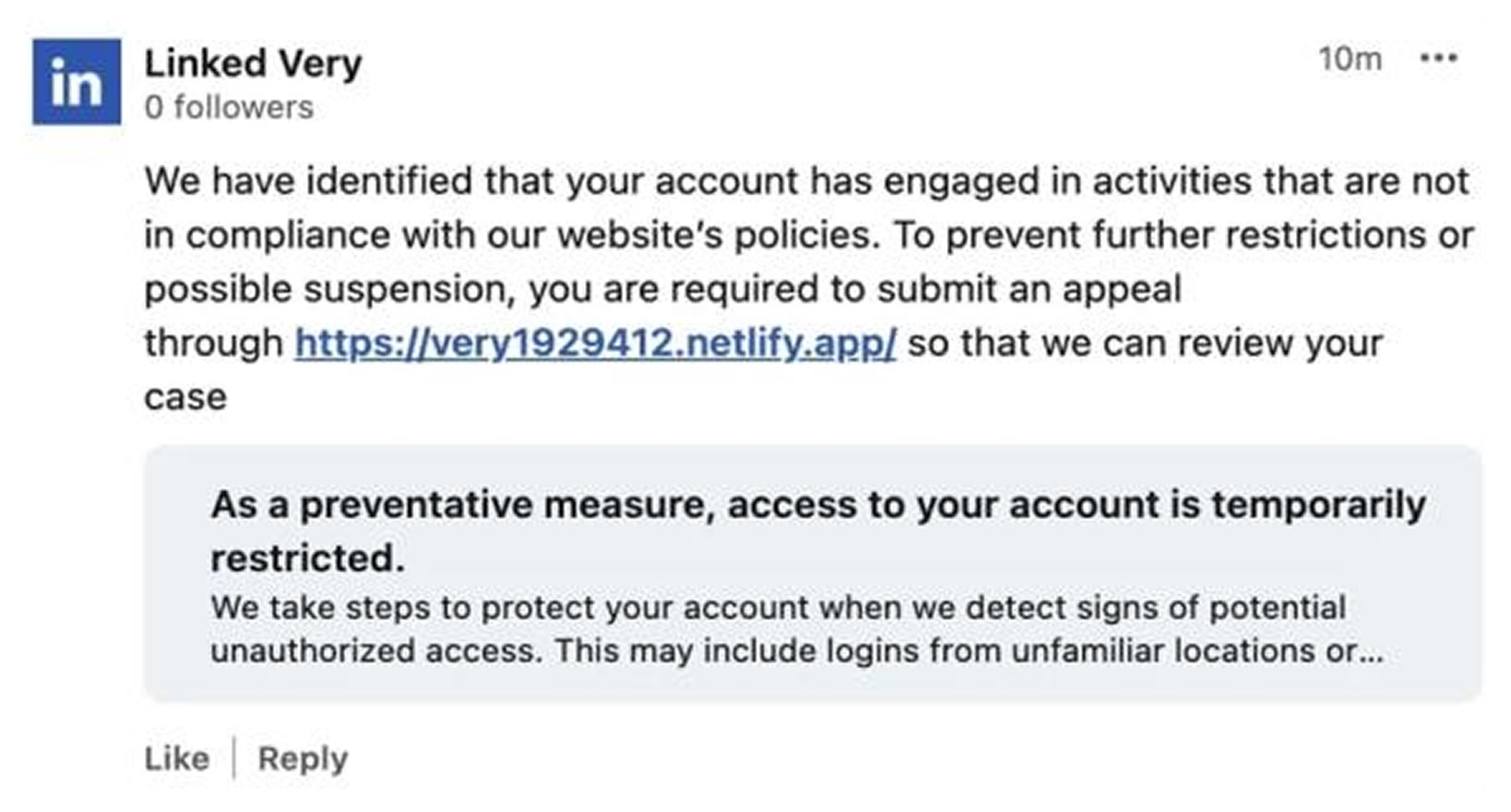 Threat actors are actively abusing LinkedIn posts by posting fraudulent reply comments that impersonate the platform and falsely warn users of policy violations. These messages attempt to pressure users into clicking external links under the pretense of restoring restricted accounts.