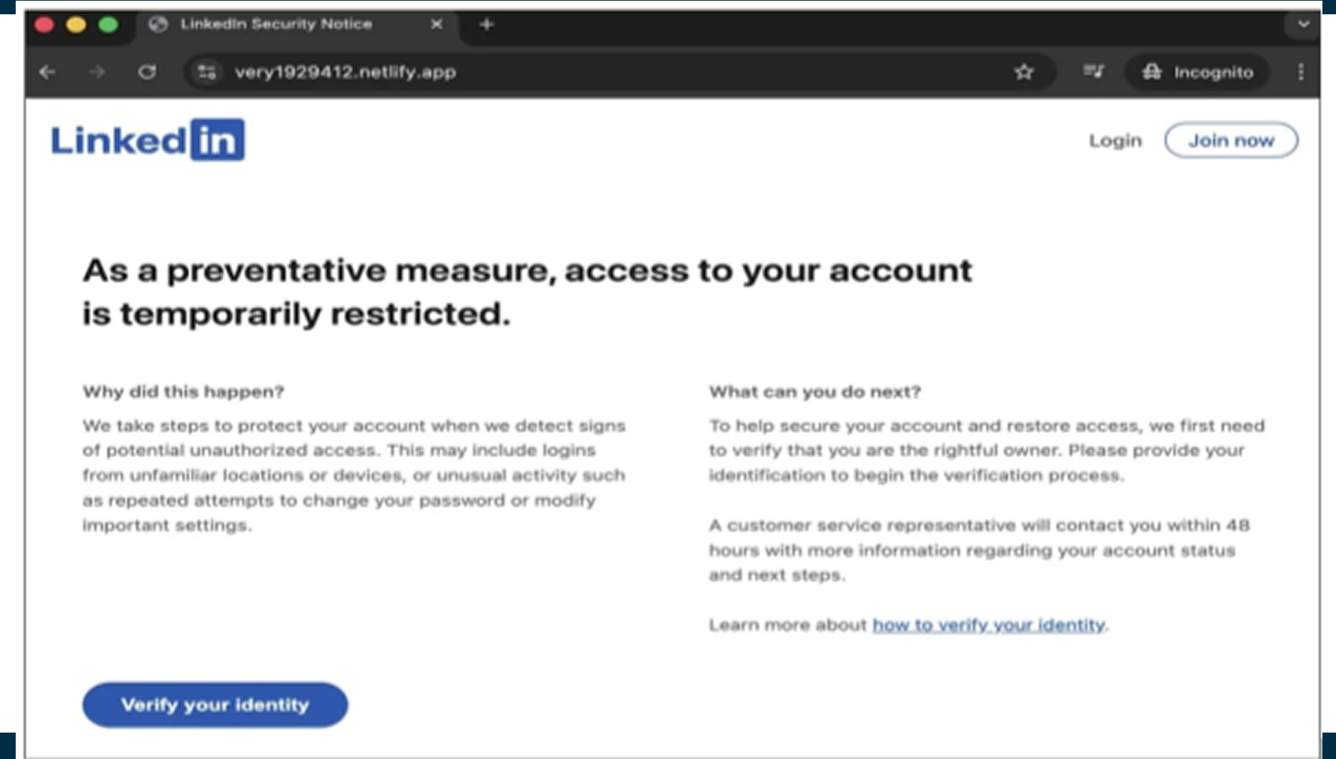 Several LinkedIn members have publicly shared examples of these deceptive comments. In one observed case, users were redirected to a phishing page that expanded on the false restriction notice and prompted identity verification. Clicking the verification button led to a secondary site where credential harvesting occurred.