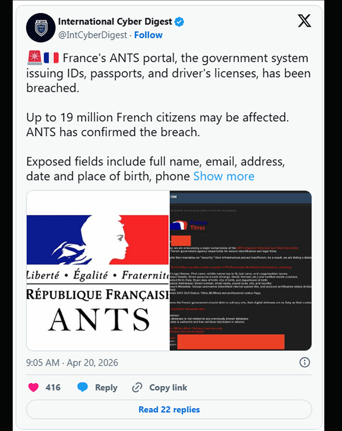 “On Wednesday, April 15, 2026, the National Agency for Secure Documents (ANTS) identified a security incident that may have led to the disclosure of data associated with personal and professional user accounts on the ants.gouv.fr portal,” the agency stated in an official announcement.