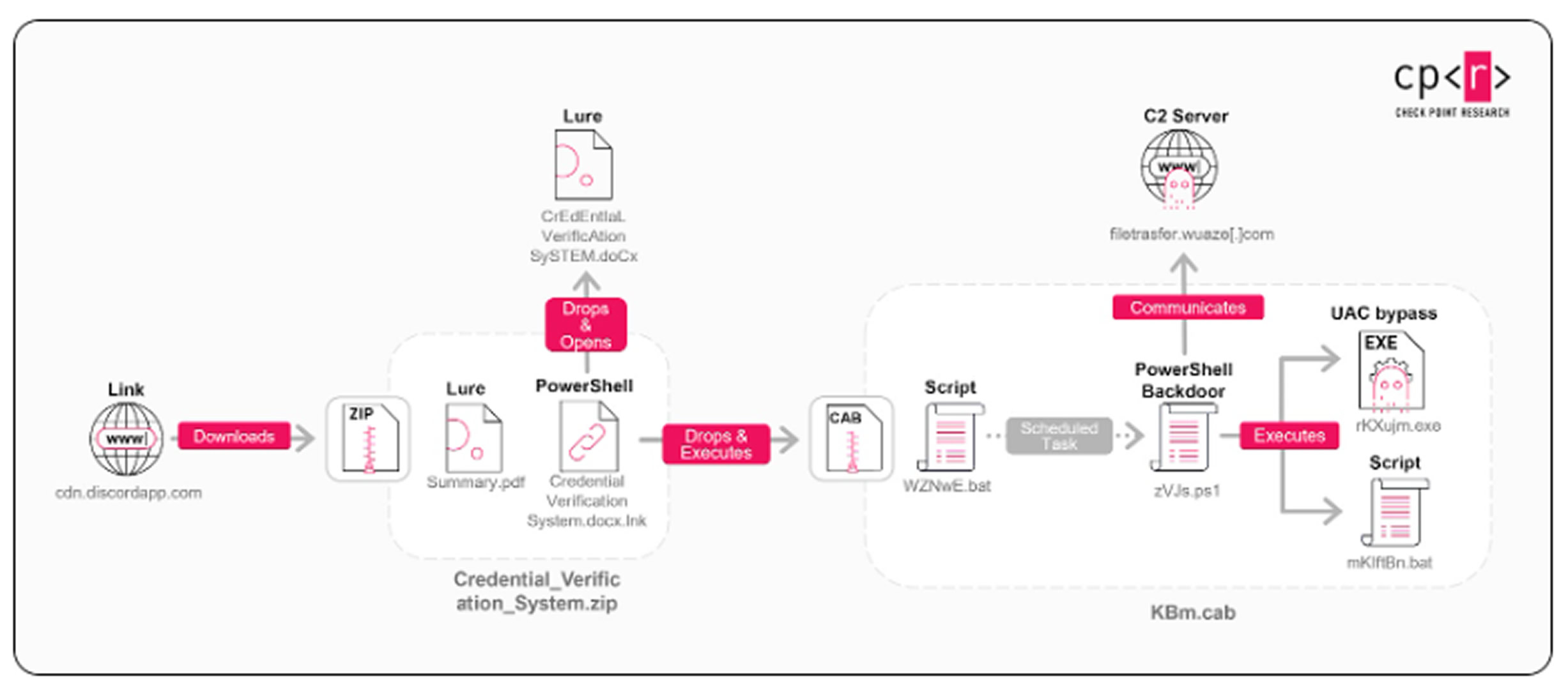The campaign detailed by Check Point uses ZIP files themed around project requirements, hosted on Discord’s CDN, to kick off a multi‑stage intrusion chain. The precise initial access path remains unclear. The chain progresses as follows: