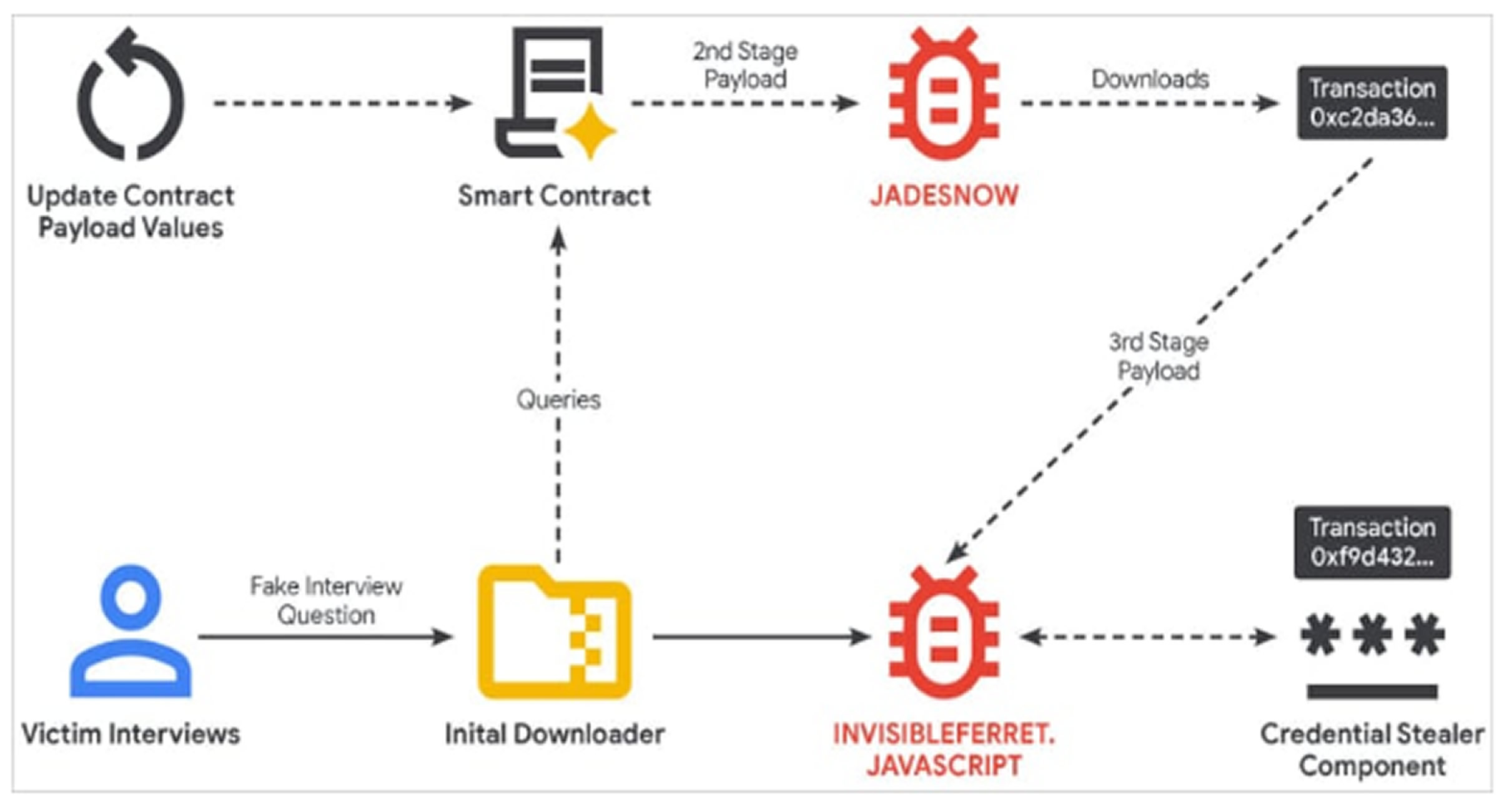 The JADESNOW downloader interacts with the Ethereum or BNB Smart Chain to retrieve the next stage payload, which is a JavaScript version of the InvisibleFerret malware used for long-term espionage.