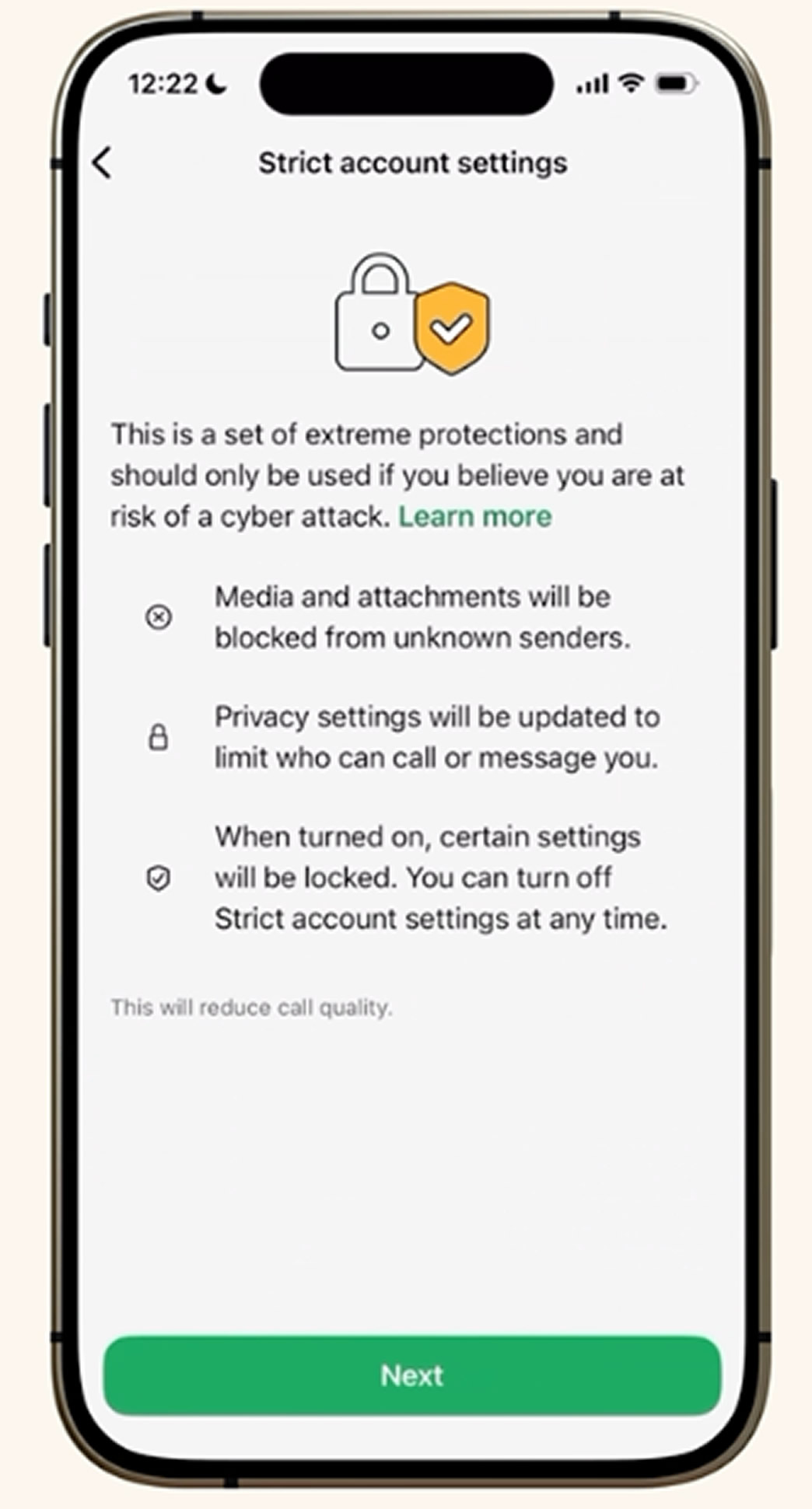 Once activated, Strict Account Settings automatically enforces the highest‑security configurations, including blocking attachments and media sent by people outside the user’s contact list.