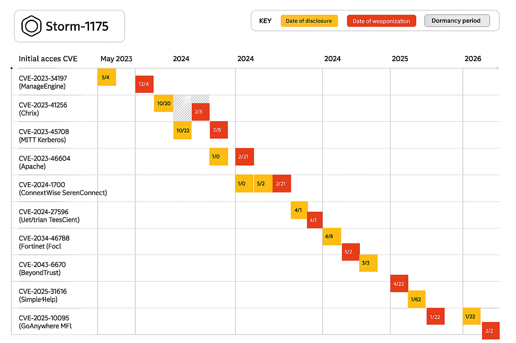 The group frequently combines multiple vulnerabilities to achieve deeper levels of access, such as escalating from initial entry to remote code execution. Storm‑1175 has also demonstrated the ability to operate across both Windows and Linux environments and, in some instances, has exploited zero‑day vulnerabilities ahead of public disclosure highlighting its advanced operational maturity.