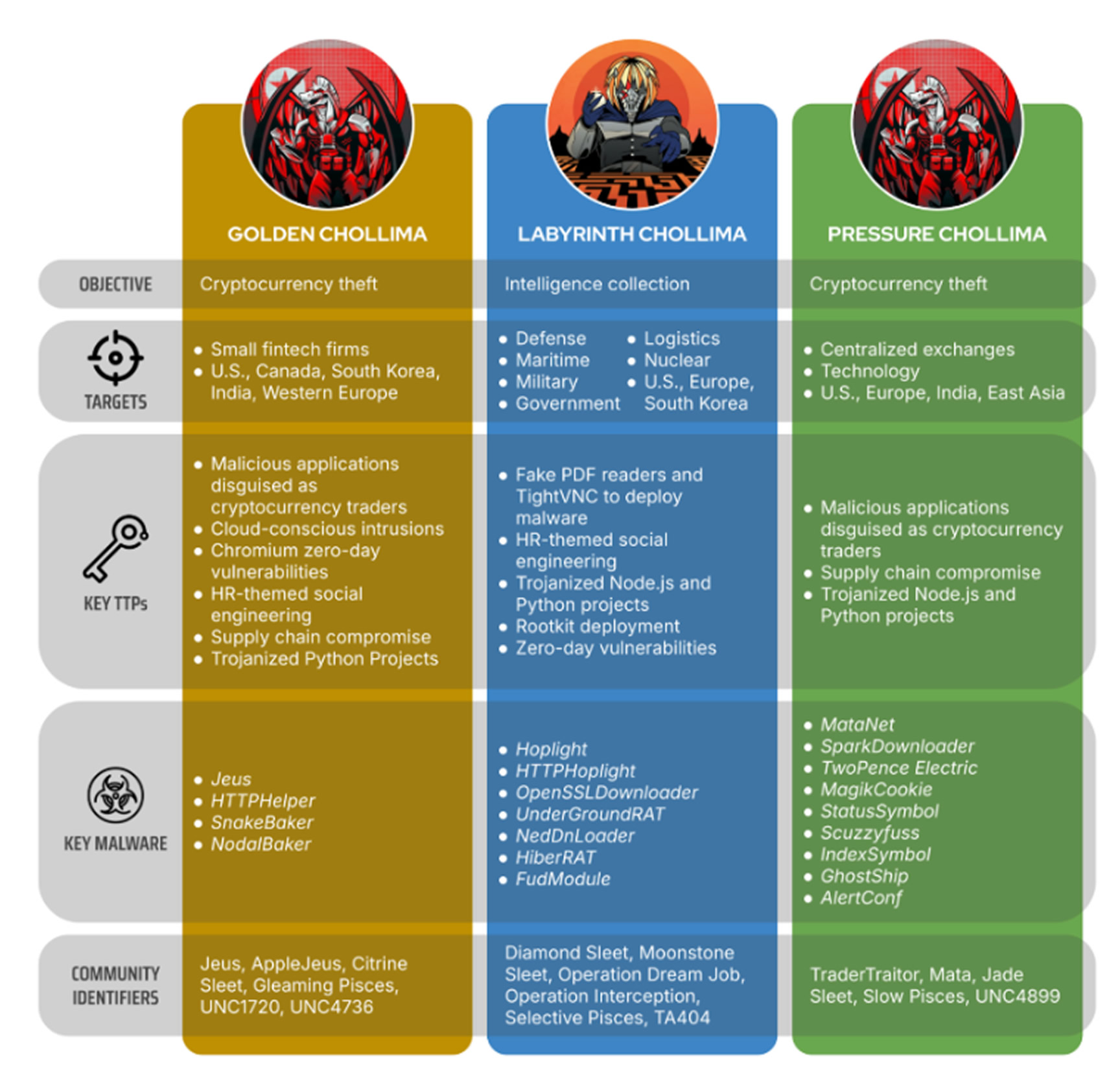 - Golden Chollima (aka AppleJeus, Citrine Sleet, UNC4736) – Conducts steady, smaller‑scale cryptocurrency thefts in developed markets.